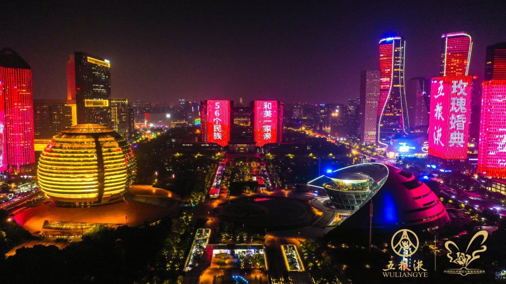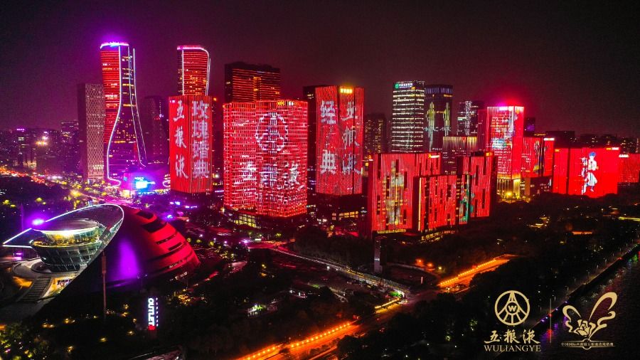 伴随着大气磅礴的灯光秀音乐,钱塘江畔、西子湖畔、武林商圈、中河高架被光彩笼罩。70万盏LED灯组成的大型灯光秀在“亚洲第一屏”西湖天幕、巨型大笨屏BIG PAD、杭州日报裙楼大屏轮番上演,呈现出花瓣飞舞、玫瑰绽放、秀美西湖以及56个民族动画形象等绚丽景象,为爱情之都杭州增添浪漫与爱意的“和美”氛围。 “和美”是爱情经久不变的主题,美酒是婚礼仪式中表达“和美”最具代表性的载体之一。古有“合卺”传统礼仪,今有“交杯酒”仪式,一杯美酒,承载着对新人和和美美、携手到老的美好期许。 五粮液,集高粱、大米、糯米、小麦、玉米五种粮食之精华而成玉液,规避了单粮酿酒原料单一、风味单一的不足,调和五味合而为一,集风味之大成,纳色、香、味之平衡,体现了“和谐包容”的最高境界,与夫妻、家庭、社会和谐共生之道息息相通。