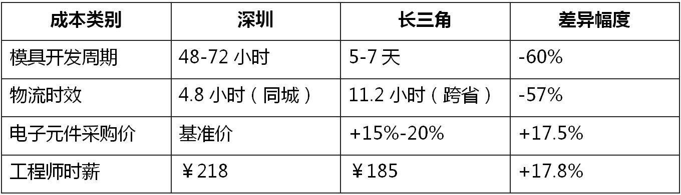 深圳的"一小时供应链圈"创造了显著的成本优势。对比两地关键指标:
