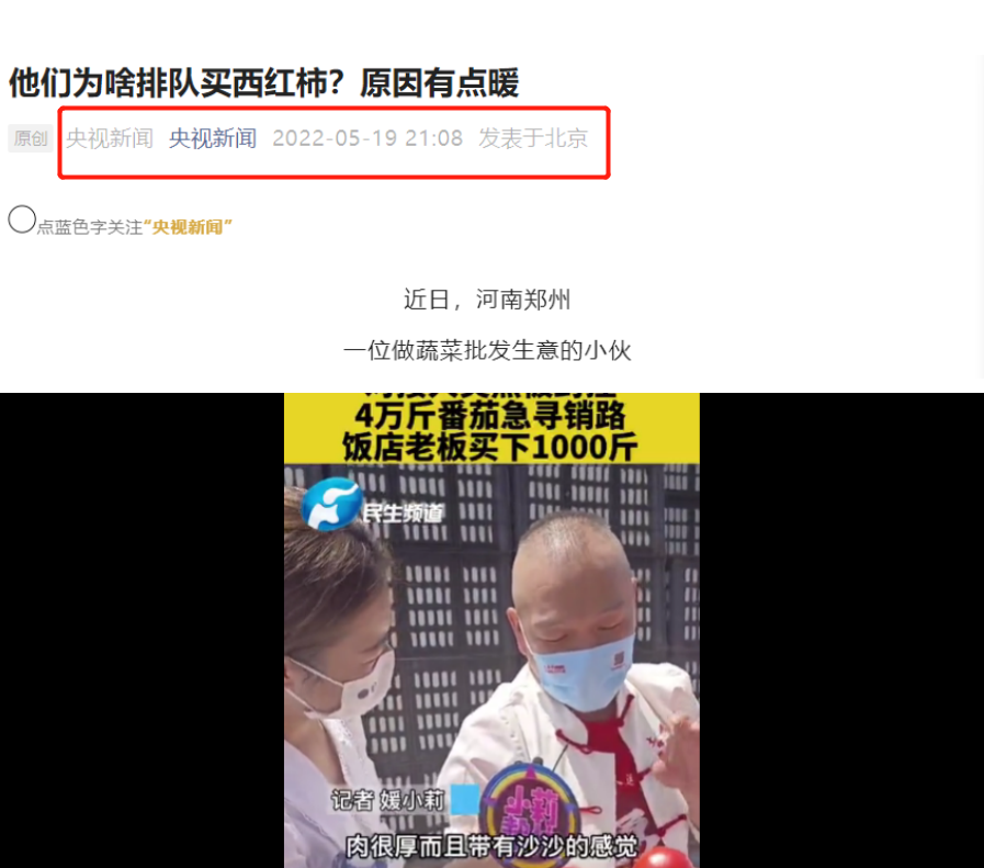 买完西红柿,杜永闯本以为事情就结束了,结果5月19日一大早就有熟人拨打了他的电话,电话那头的朋友告诉他,他在中央广播电视总台播出的新闻中见到了他。